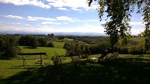 großen Platane mit Blick auf die Pyrenäen. Wir arbeiten im Freien,